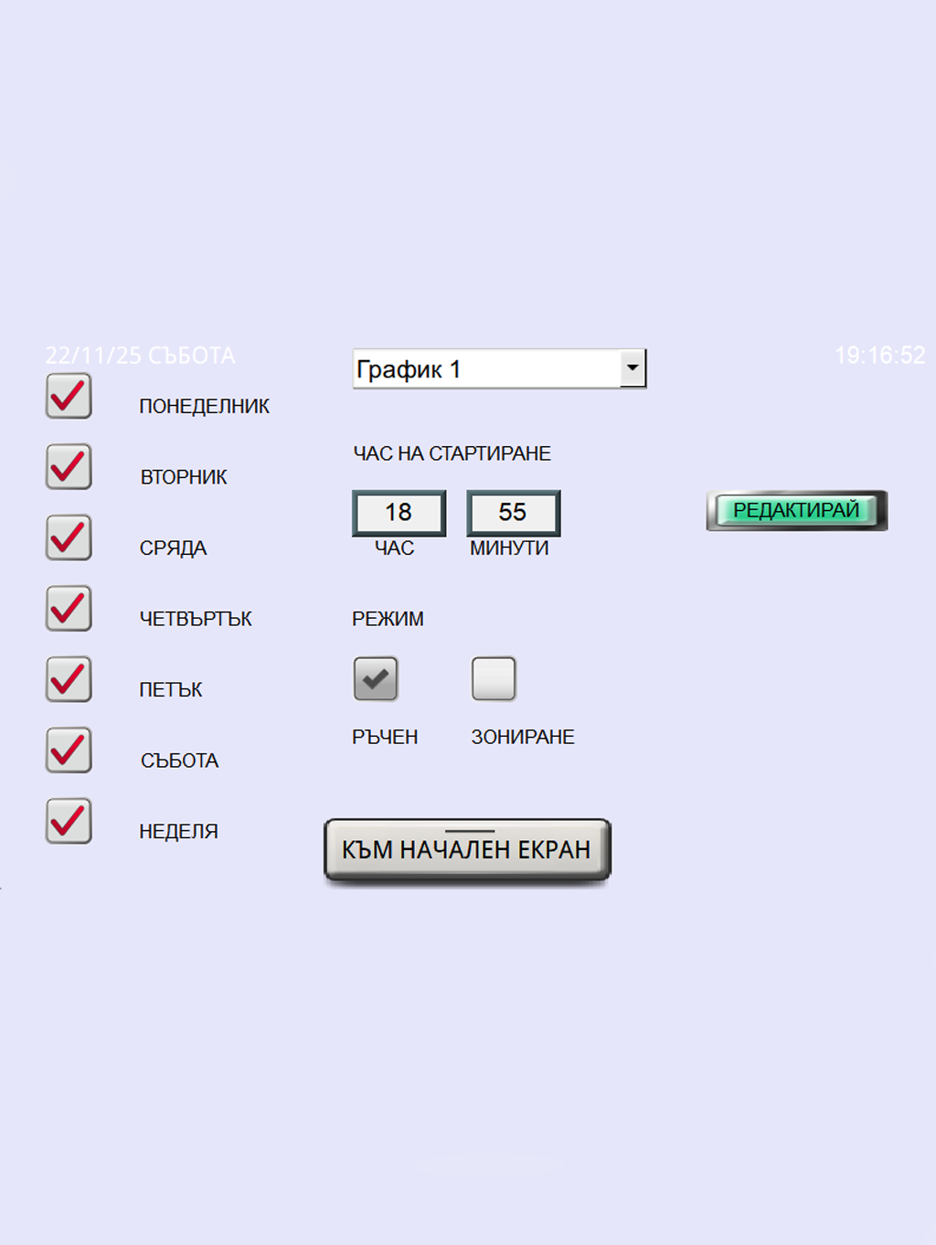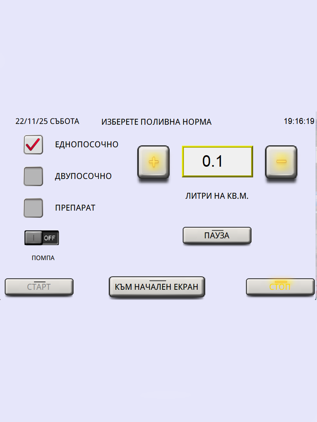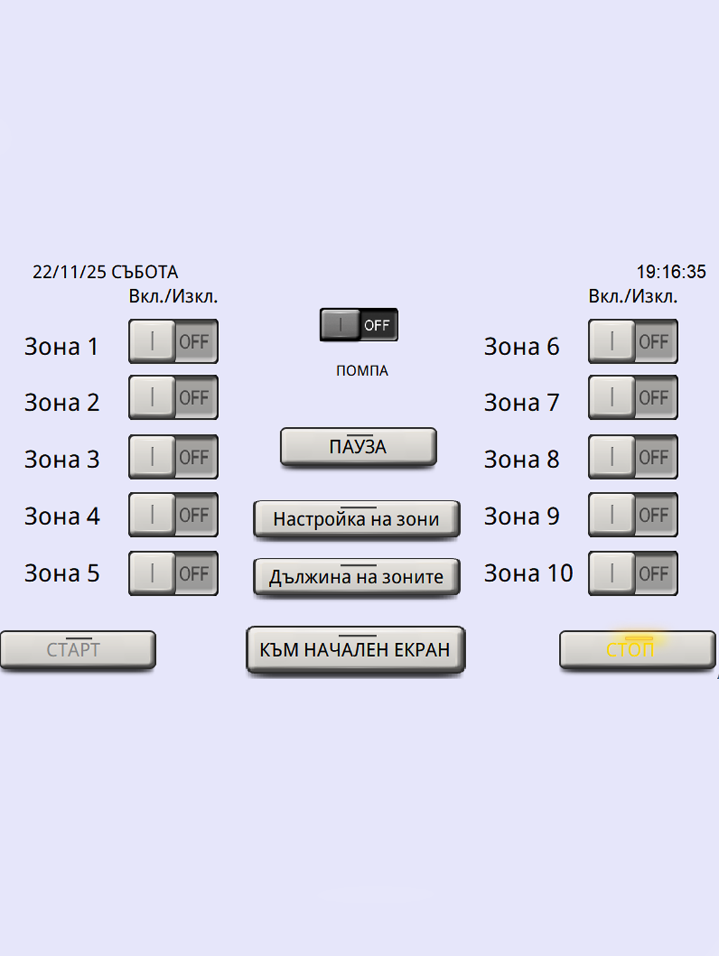 Нашият софтуер ви позволява виртуално да направите зони във вашата оранжерия. Всяка зона може да се програмира и да се избира различно количество вода в зависимост от етапа на развитие на разсадите. Предлага се и поливане по график с или без зониране. 7" сензорният екран дава достатъчно място за всяка информация.